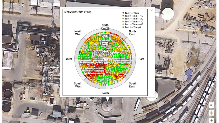 Porting API 620 / 653 MI Data to a Better UIInspection data for API 620/650 tanks can be voluminous. Many times this data is entered into an Excel spreadsheet which is then assembled into a report and goes to archive. Data visualization is poor and trends are harder to predict. There is a better way, port it to HCI’s Google Map interface. The screen shot herein displays MI data for an API tank floor color coded by material loss. Tank on-click events can show data plots as shown here, the actual MI records or tank reference documents and records. Drills down to tank components as well. If you went through the effort to get the MI data, why not take it a little further and display it with a better user interface? |