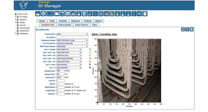 HRSG Boiler Furnace Tube End-of-Life ToolProjecting end-of-life (i.e., tube rupture) of HRSG, boiler or furnace tubes is a little tricky. On one hand you have the data gathering and input process. On the other hand is the technical assessment of what the Tmin really is. The principal failure mode we are addressing is tube wall loss by particulate erosion. The data gathering component is similar to that discussed in one of my earlier articles, "API Tank MI Time Saving Tools". First, you need to get your hands on a Olympus 38DL datalogger. Using this device you can pre-program your data points in advance and then take your UT readings as indicated by your MI diagram. The background of the MI diagram can be a sketch or photo. When you dock your the 38DL to your PC using the supplied GageView software application, you can view your data for a reality check. For the analysis, you need to install another component tool called MI Manager, offered by HCI Systems, Inc., MI Manager can import the 38DL data directly into the MI Manager database. The data can then been presented visually as shown above. Data point colors are user configurable. Material loss trends can be plotted and end-of-life projections can be assessed. |