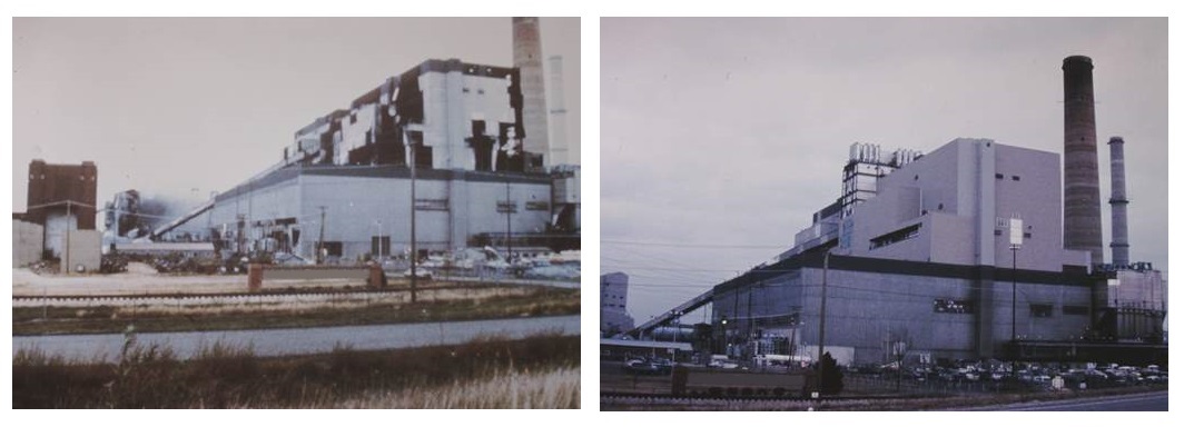 Damage Limiting Construction - Part 6 ConclusionThis segment concludes the series on damage limiting construction techniques as it relates to overpressure caused by a fire ball event (i.e., Deflagration). Although this series was focused on a coal dust deflagration, it is equally applicable for other combustible dusts, vapors and gas clouds. Deflagration events occur more often than one might think. The more damaging ones like the corn mill explosion that occurred just last week in Wisconsin is one example. If you look at the photos on the Wisconsin event you will notice that the entire building appears to have been destroyed. Obviously, damage limiting construction was not installed for that structure. I recall the quote "Those who cannot remember the past are condemned to repeat it" by George Santayana. This is why this series of articles is valid today as it was back then. The photo on the left is how I saw the plant after the event. The photo on the right is how we left it after it was re-constructed. At that time the "Humpty Dumpty" team was focused on this plant but it was the start of a $50+ million dollar dust control project encompassing all that company's coal plants. We were later called the "Dust Busters"...... |